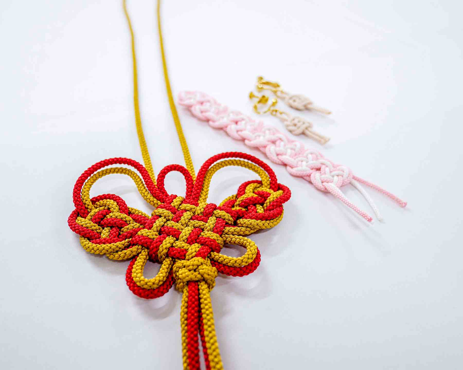 一本の紐を結び、四季の草花や蝶、とんぼ、紋などの形に表現する伝統技芸です。古来より伝わる結びを基に創作結びを取り入れて、現代生活に広く応用できる花結びです。