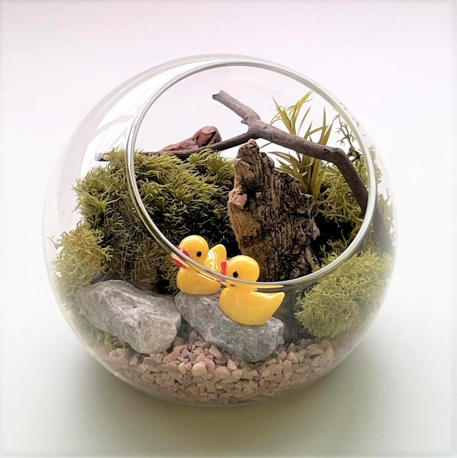 ガラスドームの中に苔をメインに、木へんや意思、小さな植物や小植物を配置して、手のひらサイズの小さな自然風景を、初心者での手軽に表現することができます。