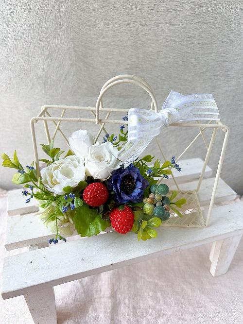 お買い物カバンの形のワイヤーの器に白いお花とストロベリー、青い実などで可愛らしくアレンジします。プリザーブドフラワーとアーティフィシャ ルフラワーを使用します。大きさ:17×5.5×14.5センチ。